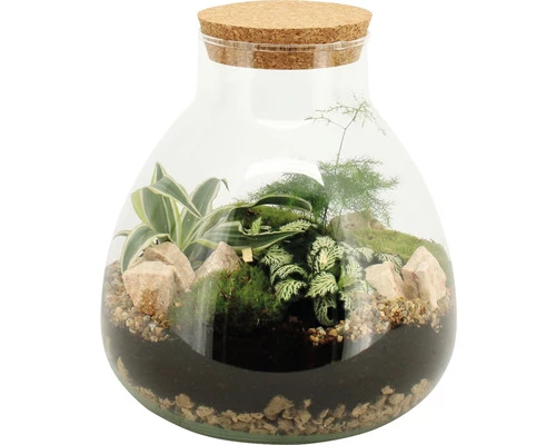 Ist Dein Flaschengarten mit einem Deckel luftdicht verschlossen, nennt man das Hermetosphäre. Das Besondere: Durch das komplett geschlossene Ökosystem geht die Pflege des Flaschengartens gegen Null. Bei Sukkulenten bleibt das Gefäß offen.