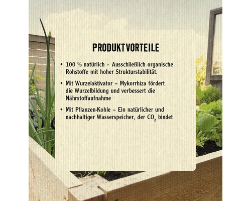 Aus 100 % organischen Rohstoffen mit hoher Strukturstabilität hergestellt, verbessert sie die Bodenqualität. Sie verfügt außerdem über einen Wurzelaktivator und Pflanzenkohle, die sich als natürlicher Wasserspeicher bewährt. Ein Rezyklat-Anteil von über 80 % macht sie enorm nachhaltig. Obendrein ist sie umweltfreundlich verpackt.