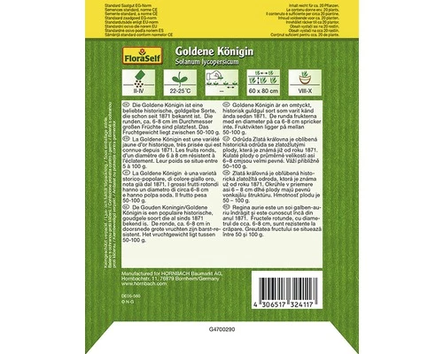 Die Goldene Königin ist eine beliebte historische, goldgelbe Sorte, die schon seit 1871 bekannt ist. Die runden, ca. 6 bis 8 cm im Durchmesser großen Früchte sind platzfest. Das Fruchtgewicht liegt zwischen 50 und 100 g.