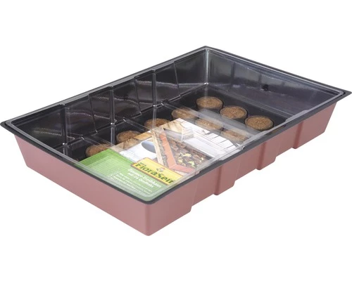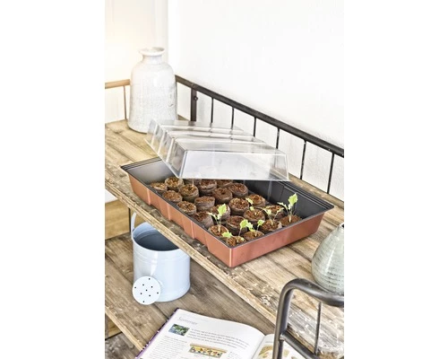Das Zimmergewächshaus von FloraSelf besteht aus einer robusten, recycelten Kunststoffschale mit Klarsichthaube und sorgt für ein Treibhausklima, in dem Keimlinge schneller und besser gedeihen – mit oder ohne Anzucht-Quelltabs.