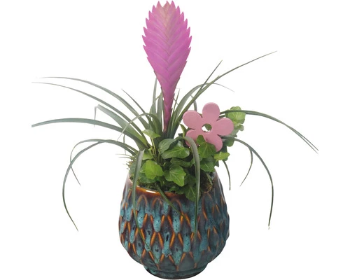 Darum solltest Du zugreifen: Das Pflanzenarrangement wird im Keramik Übertopf geliefert. Der Korb hat einen Durchmesser von 14 cm und ist samt Inhalt am besten im Halbschatten aufgehoben. Das Arrangement blüht ganzjährig und benötigt wenig Pflege. Damit sind die Tillandsia ‚Anita‘ mit ihrem farbintensivem Blütenwedel und der Efeu ideal zur Dekoration in Wohn- und Arbeitsräumen geeignet. Neben den Pflanzen ist das Arrangement mit zwei Dekostecker aus Holz dekoriert. So entsteht ein stilvolles Erscheinungsbild, welches Vorfreude auf die Frülingsszeit weckt.