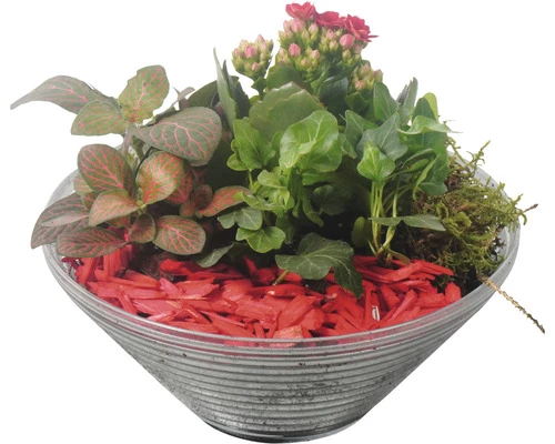 Darum solltest Du zugreifen: Du bist nun mal der kreative Typ und machst entsprechende Geschenke – freilich auch Dir selbst. Dafür eignet sich dieses Pflanzen-Arrangement ausgezeichnet. Schon allein die Glasschale zeigt Wirkung. Sie muss allerdings mit der Mosaikpflanze, dem Flammenden Käthchen (Kalanchoe) und Efeu konkurrieren. Gemeinsam sind sie jedoch unschlagbar und werden nicht nur im Wohnbereich zum floralen Blickfänger. Auch in Geschäftsräumen verbreiten sie eine gewisse Atmosphäre.